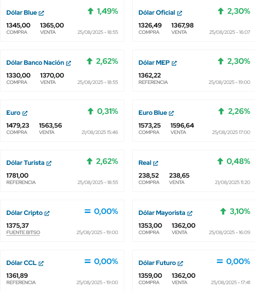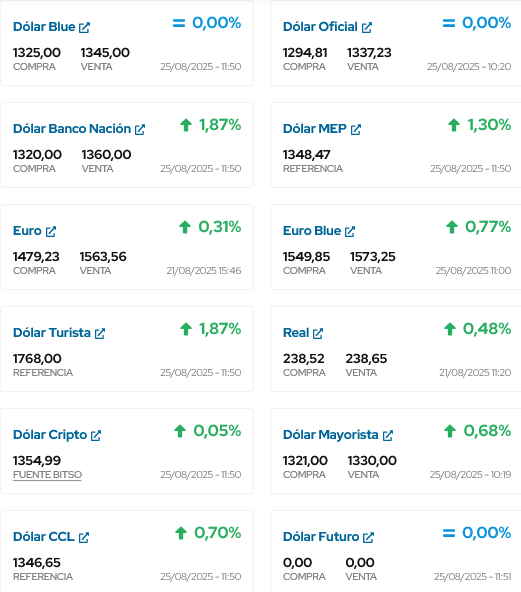 ASÍ COMIENZA COTIZANDO EL DÓLAR EN ESTE DIA 25 DE AGOSTO, COMIENZO DE LA SEMANA
