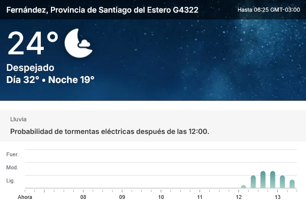 EL CLIMA EN LA CIUDAD DE FERNÁNDEZ EN ESTE DÍA 16 DE OCTUBRE