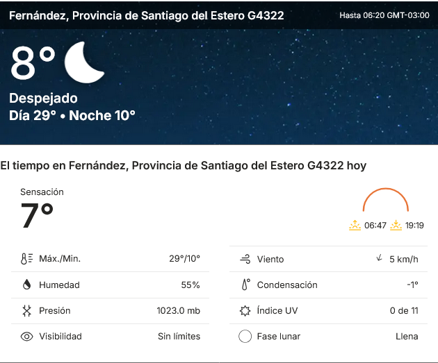 EL CLIMA EN LA CIUDAD DE FERNÁNDEZ EN ESTE DÍA 7 DE OCTUBRE
