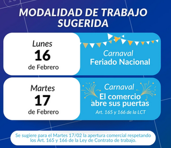 Así funcionará la atención de los comercios durante los feriados de Carnaval en Santiago del Estero. Según lo informado por la entidad, el lunes de Carnaval será feriado nacional, por lo que no habrá actividad comercial, con excepción de los servicios esenciales que habitualmente funcionan en este tipo de jornadas.